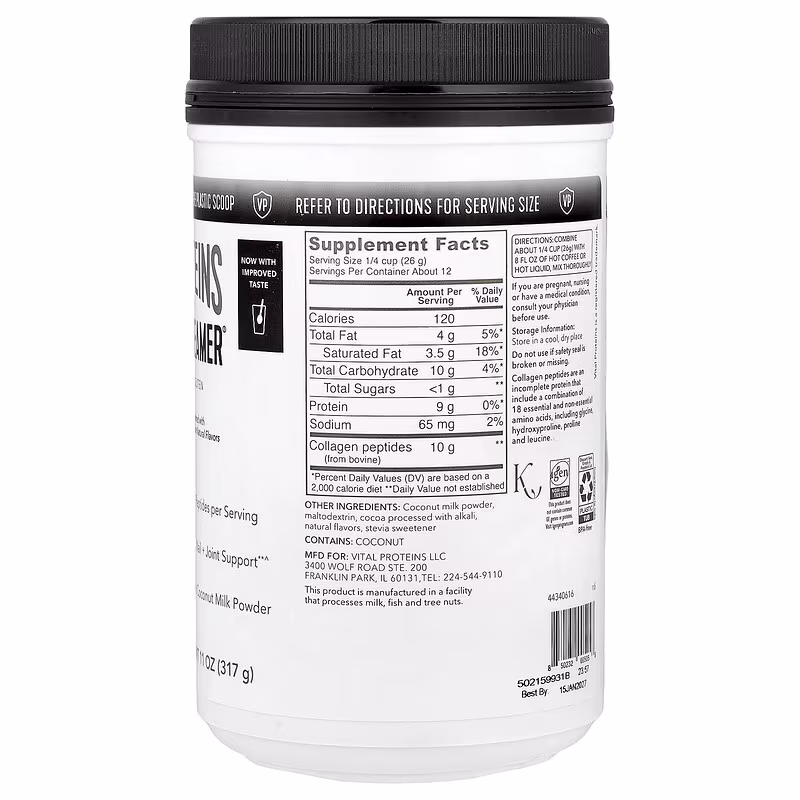 Upgrade your morning routine with Vital Proteins Collagen Creamer® made without dairy. Delivering 10 g of collagen per serving, this morning staple helps ensure a peppy start to any day. Just add to hot coffee or hot tea, stir and enjoy!